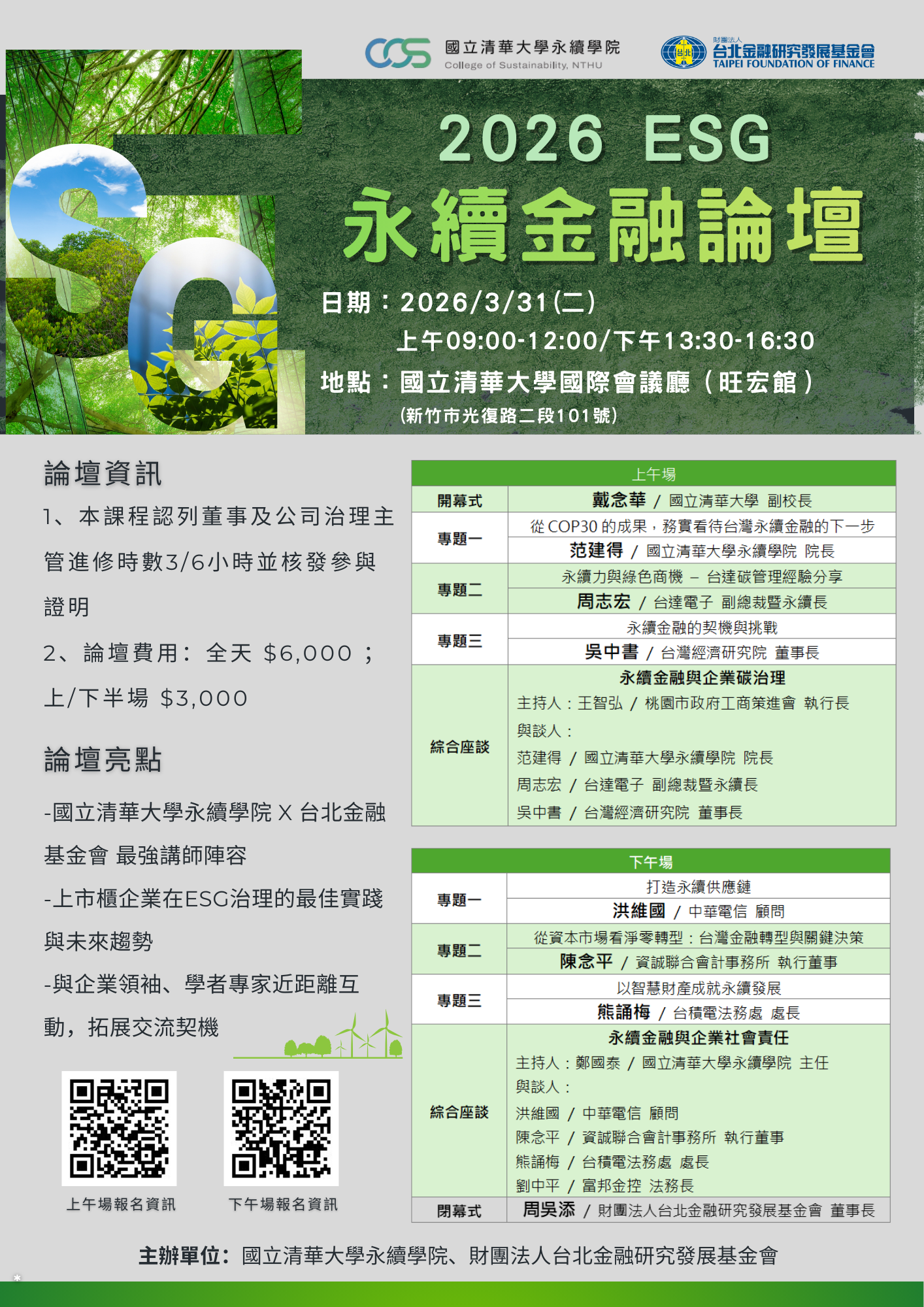 【活動】2026 ESG 永續金融論壇:報名至3月30日(一)