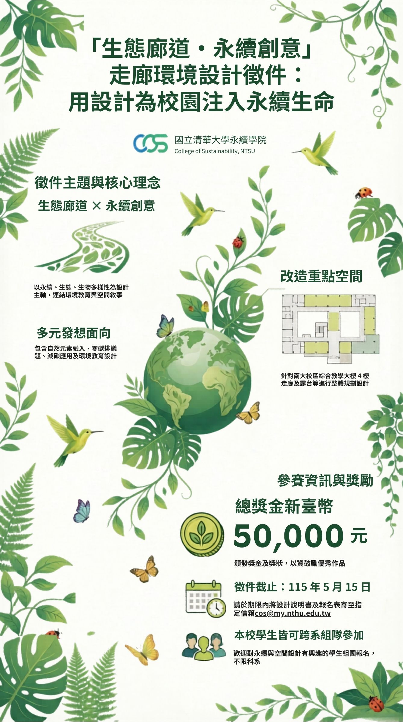 為營造具永續理念與生態意象的學習空間,國立清華大學永續學院特別辦理「生態廊道・永續創意」走廊環境概念設計徵件活動,期望透過創意設計,將學院外走廊空間轉化為結合自然、生態與永續理念的展示與交流場域 ,後續將由本院依實際需求進行設計深化與整合 。誠摯邀請對永續設計、空間規劃與生態美學有興趣之學生團隊踴躍參與,共同打造兼具教育意義與環境美感的永續廊道。
